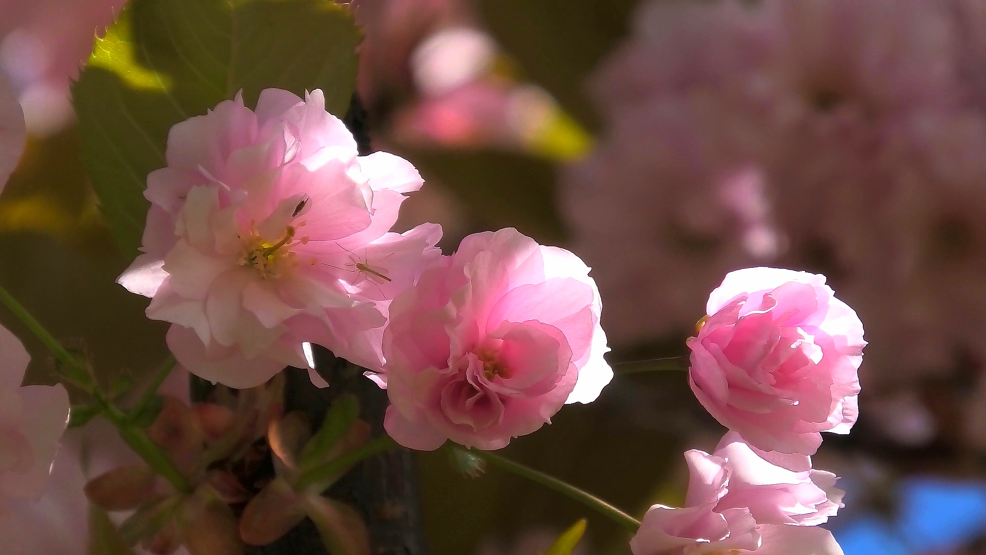 Весна. В городском сквере Петербурга расцвела японская сакура. Ещё прохладно и сильный ветер, но горожане наслаждаются цветущей природой.