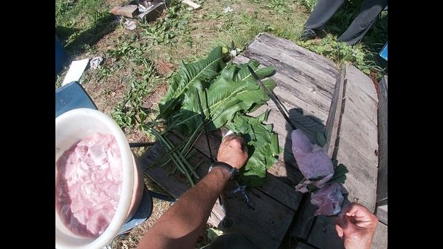 Как сделать шашлык с хреновым листом на костре.