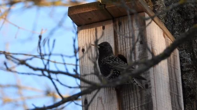 Скворцы осматривают скворечник, наблюдение птиц в Великом Новгороде, 12 апреля 2025