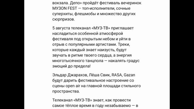 5 августа в 19:00 в гастроквартале «Три вокзала. Депо» пройдёт фестиваль вечеринок МУЗON FEST — топ-исполнители, сочные суперхиты, флешмобы и множество других сюрпризов. 5 августа телеканал «МУЗ-ТВ» приглашает насладиться особенной атмосферой фестиваля под открытым небом и уйти в отрыв с популярными артистами. Треки, которые каждый знает наизусть, будут звучать в ритме твоего сердца, а энергия многотысячного танцпола — накалять градус эмоций до предела! Эльдар Джарахов, Лёша Свик, RASA, Gazan будут дарить фестивальное настроение со сцены open air на главной площади стильного пространства. Телеканал «МУЗ-ТВ» знает, как провести самое тёплое время в году незабываемо — в кругу любимых звёзд, зажигая под их треки не в наушниках, а на расстоянии вытянутой руки! Встречаемся на главной площади «Три вокзала. Депо» в субботу, 5 августа, ровно в 19:00. Вход свободный.
