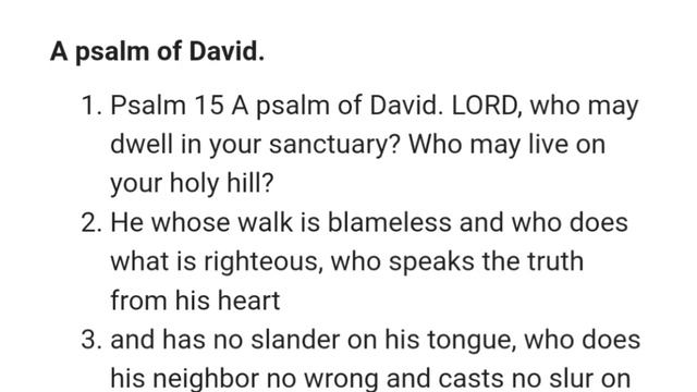 Chapter #Psalms #NIV #OldTestment #BIBLEINAYEAR #시편#영어성경통독 #성경통독 [0:00] Chapter 15 [0:04] A psalm of David. DRAMA BIBLE(KOREAN & ENGLISH) https://youtu.be/iLVuc2bMMp0