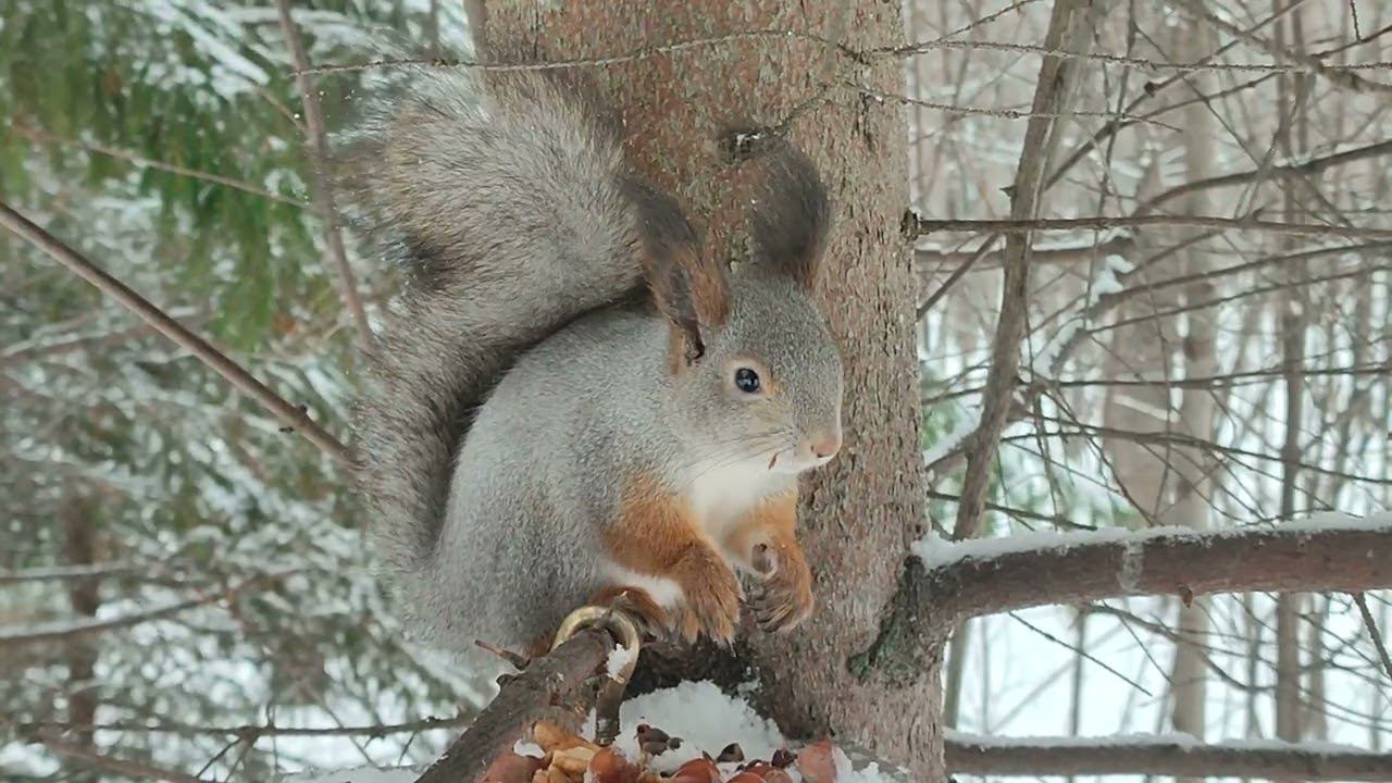 Белка грызёт кедряшки на крыше кормушки