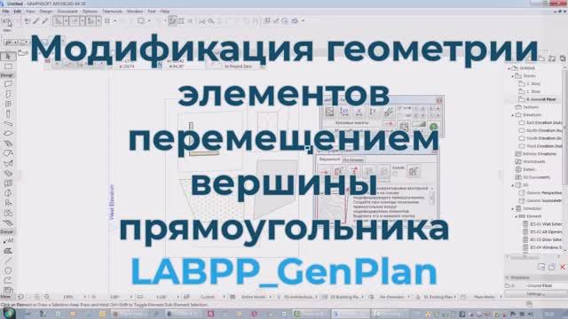 Деформирование геометрии элементов смещением вершины описывающего прямоугольника. В проектах с ландшафтом и рельефом часто встречаются неточности. Так после отрисовки элементов в модели их расположение и форма может не полностью соответствовать карте. Модификация в таком случае занимает значительное время или вовсе нецелесообразна - приходится перерисовывать заново. Одним из эффективных приемов является деформация перемещением вершины прямоугольника, расположенного вокруг элементов. Полилинией рисуется прямоугольник. Он выделяется в проекте и кнопкой на панели программы регистрируется как модифицирующий. Затем от одной из вершин рисуется вектор модификации. Остается только выделить нужные элементы и выполнить функцию модификации. Можно задать штриховки, которые отфильтруют точки, которые не будет затрагивать модификация или наоборот, точки, которые буду модифицированы, а остальные - нет.