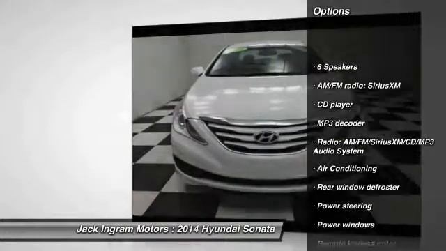 2014 Hyundai Sonata GLS http://www.JackIngram.com For more information on this vehicle and our full inventory, call us at 334-420-7700 Jack Ingram Motors 227 Eastern Blvd. Montgomery AL 36117 Gray Cloth. The car you've always wanted! Your lucky day! Are you interested in a truly wonderful car? Then take a look at this great-looking 2014 Hyundai Sonata. This outstanding Hyundai is one of the most sought after used vehicles on the market because it NEVER lets owners down. Car and Driver credits Sonata with new styling and driving enhancements. Visit our virtual showroom 24/7 at jackingram.com, or stop by our used car lots in Montgomery, Alabama to view all of our used cars.
