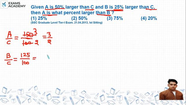Given A is 50% larger than C and B is 25% larger than C, then A is what percent larger than B ? (1) 25% (2) 50% (3) 75% (4) 20% Ssc cgl Previous Year questions Percentage previous year questions Ssc previous year questions #Examsacademy #SSCCGL #Percentage #Ssc #Sscchsl #Ssccpo #Sscmaths #Percentagepreviousyearquestions #Percentageforssc #mathpreviousyearquestions #Examsacademymaths #Percentagevideos #percentagefractionequivalent #Percentagetricks #Percentageformulas We Clear your doubts for all Competitive Exams by experienced faculties! Just Click here : www.ExamsAcademy.com Subscribe to our channel for all kinds of competitive exams preparation. #SSC #Railways #Banking #Insurance #UGCNet #UPSC #StatePCS Follow us on Social Media : Facebook : https://www.facebook.com/examsacademy/ Twitter : https://twitter.com/Examsacademy Telegram : https://telegram.me/Examsacademy Instagram : https://instagram.com/Examsacademy