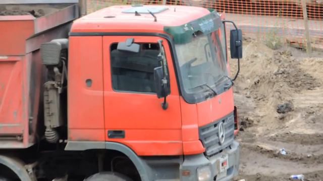 Застрял на стройке Мерседес самосвал, Экскаватор его несколько раз выталкивал.