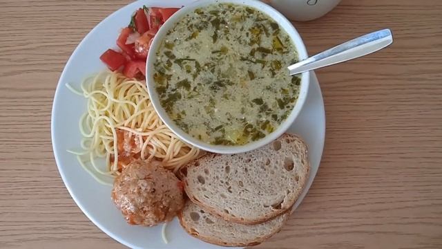 На обед: зелёный борщ со щавля, макароны и тефтеля, коф?