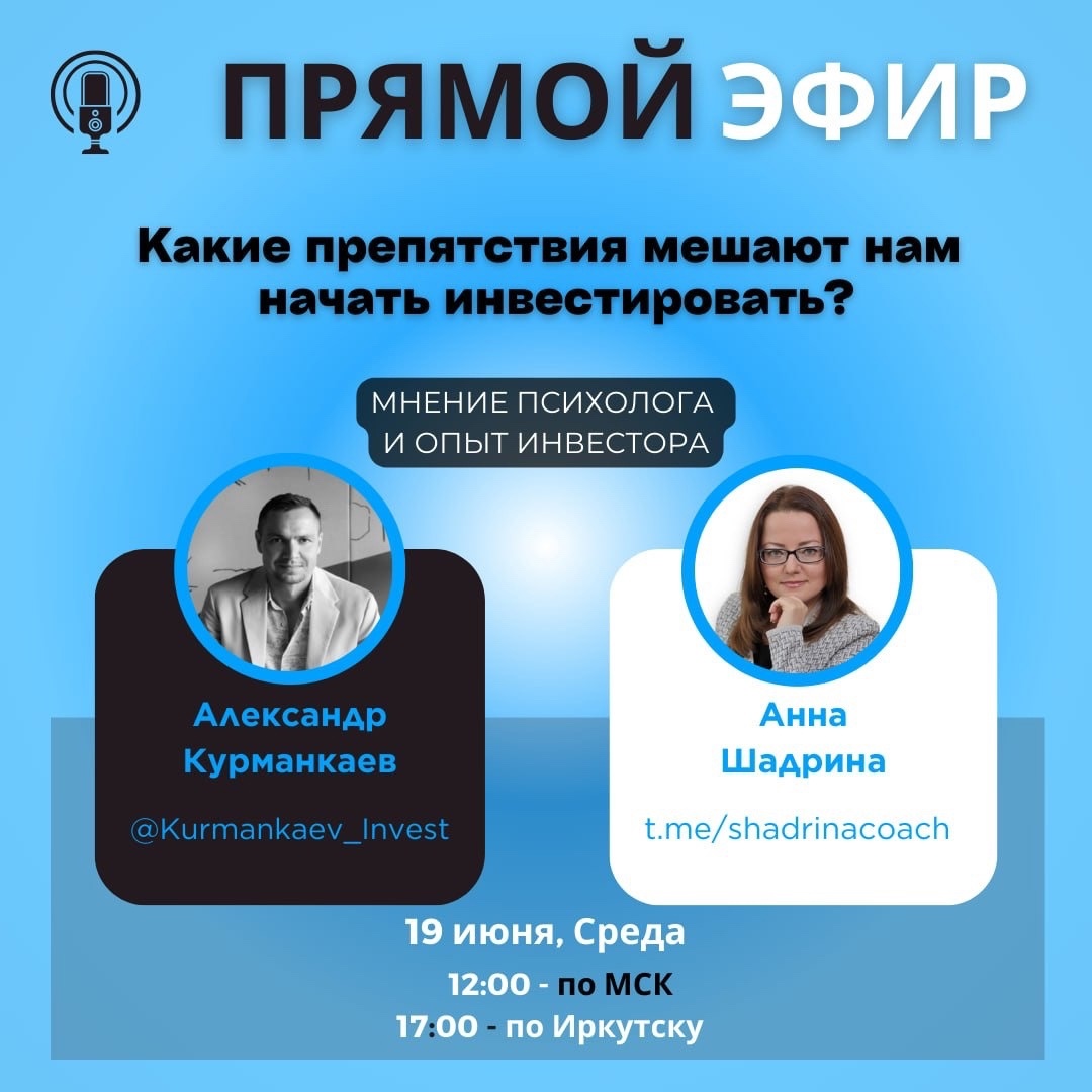 Прямой Эфир "Какие препятствия мешают нам начать инвестировать?” на эфире ты посмотришь на тему инвестирования с другой стороны. Что обсудим и о чем поговорим? - Какой основной мотив инвестировать? - Почему одной мотивации недостаточно? - Что стояло у меня пути к инвестированию? И это не недостаток денег. - Как наши убеждения мешают нам на пути к финансовым целям? В эфире все желающие смогут подключиться к диалогу и задать свои вопросы. Гость и спикер эфира - Анна Шадрина, г. Ангарск https://t.me/shadrinacoach : :▪ Дипломированный психолог с 25-ти летним опытом. :▪ Коуч с международной сертификацией. Ведущий эфира - Курманкаев Александр, г. Иркутск: ▪ Строитель, Инвест-брокер, Инвестор. ▪ Помогаю инвесторам создать и увеличить капитал и пассивный доход на недвижимости - подбирая персональные инвест-решения. Поставь напоминание в календарь и подключайся: в среду 19 июня в 17:00 по Иркутску или 12 по МСК. Если вы хотите, можно написать волнующий вопрос в комментариях заранее, чтобы мы ответили на него в эфире. Почему нужно быть на эфире? Потому что, так вы сможете: 1. Подготовить и задать актуальный вопрос связанный с ограничивающими убеждениями. 2. Получить персональный ответ от эксперта.