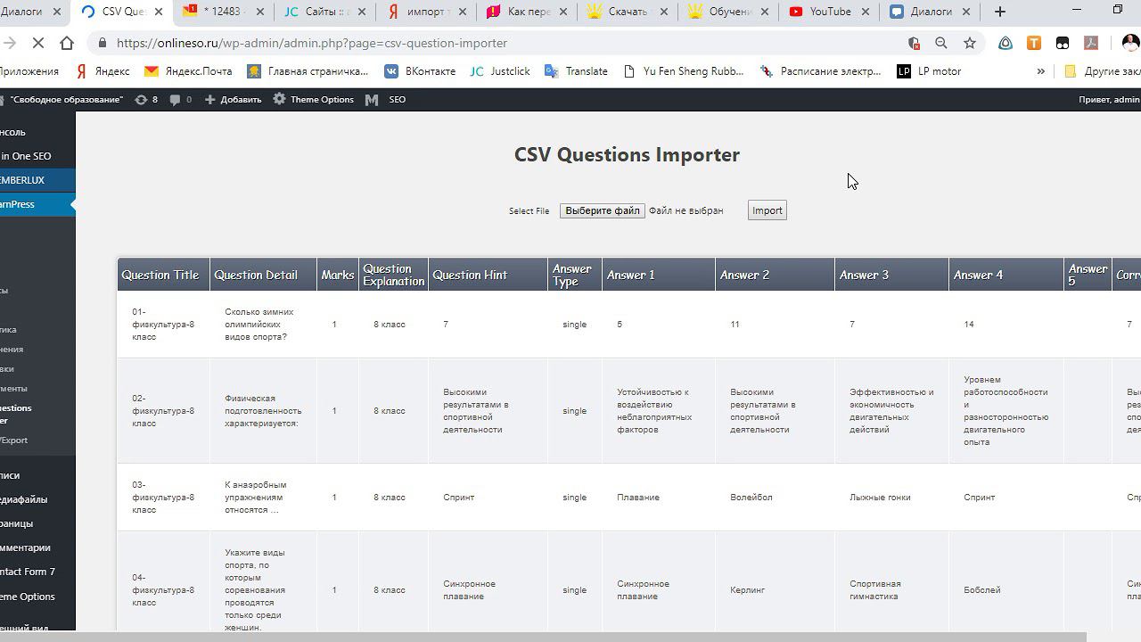 импорт вопросов, создание тестов, прикрепление к курсу
