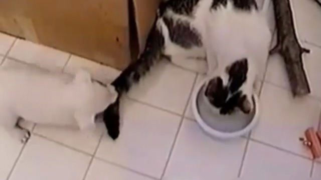 Щенки не дают кошке спокойно поесть