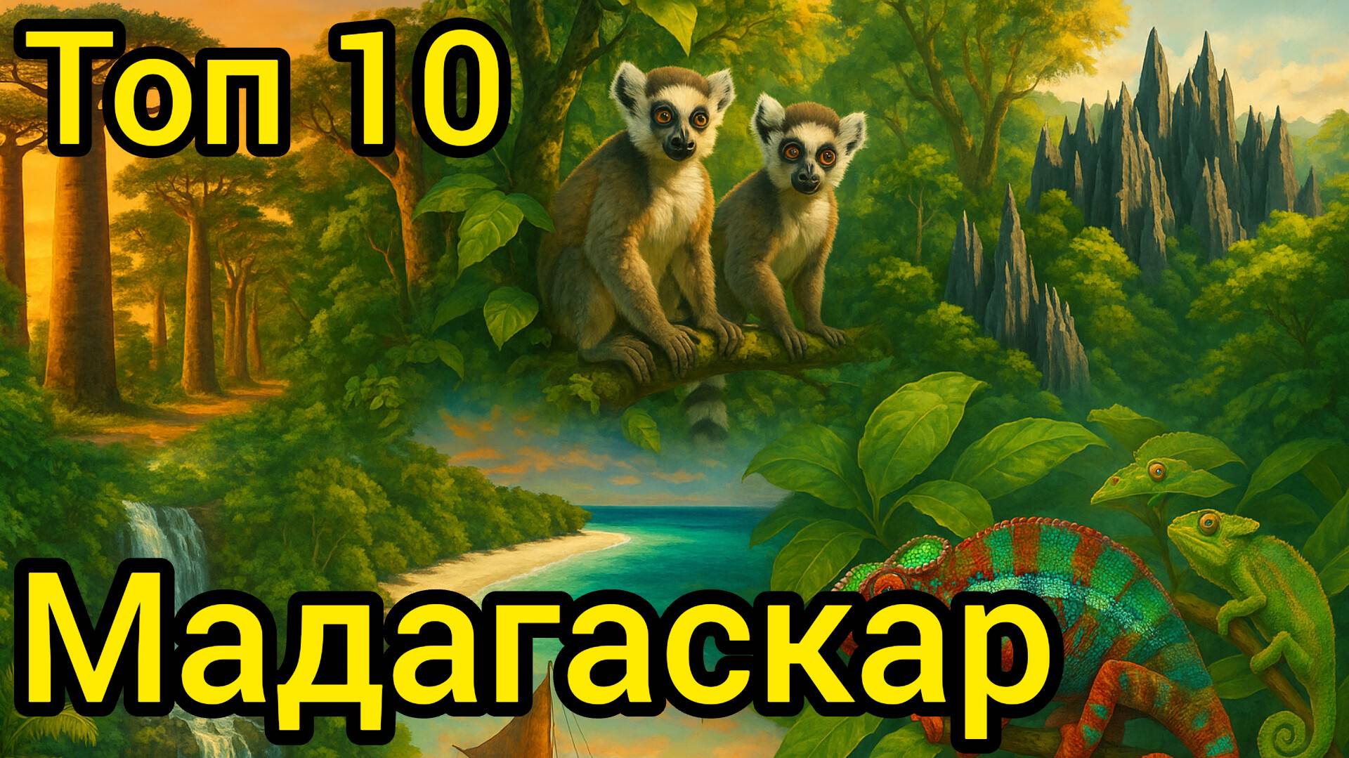 10 удивительных мест на МАДАГАСКАРЕ. Мадагаскар — остров загадок, удивительной природы и редких животных, которых нет больше нигде. Здесь пустыни соседствуют с джунглями, а баобабы возвышаются над саваннами. В этом видео — 10 самых удивительных и популярных мест Мадагаскара, которые стоит увидеть каждому путешественнику! 1. Аллея баобабов Это одно из самых узнаваемых мест острова. Огромные баобабы высотой до 30 метров растут вдоль дороги в регионе Менабе, создавая волшебный пейзаж. Особенно красиво здесь на закате. Эти деревья — эндемики, а местные считают их священными. Аллея символизирует хрупкость уникальной природы Мадагаскара. 2. Национальный парк Исалу Парк на юге острова славится скальными каньонами, природными бассейнами и водопадами. Здесь можно встретить редких лемуров и хамелеонов. Песчаниковые пейзажи напоминают марсианские. Любители треккинга найдут здесь настоящее приключение и дикие красоты природы. 3. Остров Нуси-Бе Популярный остров-курорт с белыми пляжами, коралловыми рифами и ароматами иланг-иланга. Здесь можно заняться дайвингом, сноркелингом и отдохнуть в уютных отелях. В заповеднике «Лемурия-Ленд» живут лемуры и хамелеоны. Это идеальное место для комфортного экотуризма. 4. Андасибе-Мантадия Национальный парк недалеко от столицы. Здесь обитает крупнейший лемур — индри, чей зов слышен за километры. Парк делится на доступную часть Андасибе и дикую — Мантадию. Влажные джунгли, редкие птицы и гигантские хамелеоны делают это место настоящим раем для натуралистов. 5. Цинги-де-Бемараха Уникальный «каменный лес» из острых известняков — объект ЮНЕСКО. Подвесные мосты и узкие тропы ведут к смотровым площадкам с потрясающими видами. В этих лабиринтах скрываются редкие животные. Это одно из самых захватывающих мест на острове для искателей экстрима. 6. Река Цирибихина Популярный маршрут на лодках. По пути — водопады, купания в лагунах, ночёвки под звёздами. Вы увидите лемуров, птиц и жизнь деревень. Путешествие по реке — это неспешное знакомство с настоящим Мадагаскаром, природой и местной культурой. 7. Национальный парк Раномафана На востоке острова, славится горячими источниками и влажными лесами. Здесь обитает золотистый бамбуковый лемур и множество других редких видов. Парк оборудован для туристов — есть тропы, базы и гиды. Это сочетание научной ценности и расслабляющего отдыха. 8. Национальный парк Анкарана Парк на севере знаменит карстовыми пейзажами, пещерами и подземными реками. Здесь живут лемуры, летучие мыши и редкие гекконы. Это одно из крупнейших пещерных мест в Африке. Анкарана также важен для местных общин, охраняющих священные ритуальные зоны. 9. Остров Сент-Мари Райский уголок с пляжами, бухтами и кокосовыми пальмами. Здесь находится старейшее пиратское кладбище и лучшие условия для наблюдения за китами в июле–сентябре. Туристы приезжают ради уединения, морских прогулок и аутентичной атмосферы. 10. Залив Ифати Юго-запад острова. Белоснежные пляжи, лагуны и коралловые рифы делают Ифати идеальным местом для сноркелинга, дайвинга и наблюдения за черепахами. Здесь — мангры, рыбацкие деревни и спокойная атмосфера. Несмотря на популярность, залив остаётся нетронутым и душевным. Мадагаскар — не просто остров, а отдельный мир, полный открытий и вдохновения. Здесь каждый пейзаж — как иллюстрация к 