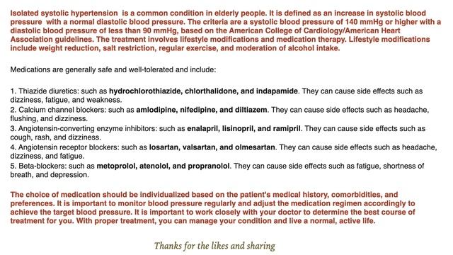Об этом видео:Средства для лечения изолированной систолической гипертензии у пожилых людей Изолированная систолическая гипертензия является распространенным состоянием у пожилых людей. Определяется как повышение артериального систолического давления при нормальном диастолическом артериальном давлении. Критериями у пожилых людей является систолическое артериальное давление 140 мм рт. ст. или выше с диастолическим менее 90 мм рт. ст., согласно рекомендациям Американского колледжа кардиологов/Американской кардиологической ассоциации. Лечение у пожилых людей предполагает изменение образа жизни и медикаментозную терапию. Изменения образа жизни включают снижение веса, ограничение соли, регулярные физические упражнения и умеренное потребление алкоголя. Лекарства безопасны, хорошо переносятся и включают: 2. Тиазидные диуретики: такие как гидрохлоротиазид, хлорталидон и индапамид. Могут вызывать такие побочные эффекты, как головокружение, усталость и слабость. 3. Блокаторы кальциевых каналов (БКК): такие как амлодипин, нифедипин и дилтиазем. Могут вызывать побочные эффекты, такие как головная боль, приливы и головокружение. 4. Ингибиторы ангиотензинпревращающего фермента (АПФ): такие как эналаприл, лизиноприл и рамиприл. Могут вызывать такие побочные эффекты, как кашель, сыпь и головокружение. 5. Блокаторы рецепторов ангиотензина (БРА): такие как лозартан, валсартан и олмесартан. Могут вызывать такие побочные эффекты, как головная боль, головокружение и усталость. 6. Бета-блокаторы: такие как метопролол, атенолол и пропранолол. Могут вызывать побочные эффекты, такие как усталость, одышка и депрессия. Выбор препарата должен быть индивидуальным исходя из истории болезни пациента, сопутствующих заболеваний и предпочтений. Важно регулярно контролировать давление и соответственно корректировать схему лечения для достижения целевого уровня. Важно тесно сотрудничать с врачом, чтобы определить лучший для вас курс лечения. При правильном лечении вы сможете контролировать свое состояние и жить нормальной активной жизнью.