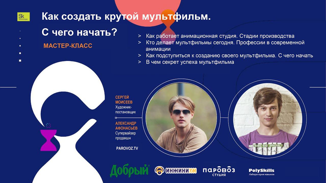 Практический воркшоп: «Как создать крутой мультфильм. С чего начать?» На мастер-классе узнаем: кто создает мультфильмы сегодня: профессии в современной анимации; как работают современные анимационные студии: стадии производства мультфильма; как подступиться к созданию своего мультфильма: с чего начать, какую программу выбрать; в чем главный секрет успеха мультфильма. Спикеры: Сергей Моисеев, художник-постановщик мультсериалов анимационной студии “Паровоз” Александр Афонасьев, супервайзер продакшн мультсериалов анимационной студии “Паровоз”. Подробнее познакомиться с анимационной студией можно на сайте: https://parovoz.tv/.