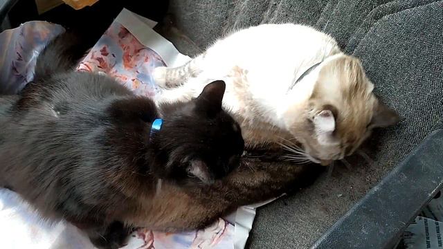 У котов Чернухи и Беляшика парко-хозяйственный день. Увлеченно друг друга вылизывают после поедания сметаны.