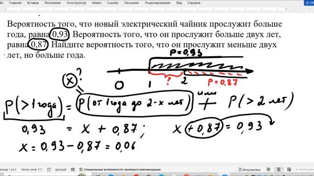 Домашнее задание на сайте РешуЕгэ https://math-ege.sdamgia.ru/test?id=60395734 Этот же тест можно распечатать https://vk.com/doc12981903_674809023?hash=L5njchuRG57h9ea3N1FZtClo3wrBkRE3bAjujubQjxL&dl=YLzOopptIRzwRjRirBfZqK9uzx3N1SW8CdtW2yhlFmT Рабочая тетрадь со всеми прототипами этого задания (сложная теория вероятности )https://vk.com/doc12981903_674796112?hash=3rpBemRBkqBKQcCE5pqGxY7K3c7vAB9HR7iTo48ZLCz&dl=IpnvqSeUtOEpVq89feHqKaWX6fSiNH5KfdlRgXU3Xng Моя группа в ВК https://vk.com/clubinnaleonidovna 1) Вероятность того, что новый электрический чайник прослужит больше года, равна 0,93. Вероятность того, что он прослужит больше двух лет, равна 0,87. Найдите вероятность того, что он прослужит меньше двух лет, но больше года. 2) Из районного центра в деревню ежедневно ходит автобус. Вероятность того, что в понедельник в автобусе окажется меньше 18 пассажиров, равна 0,82. Вероятность того, что окажется меньше 10 пассажиров, равна 0,51. Найдите вероятность того, что число пассажиров будет от 10 до 17. 3) Вероятность того, что на тестировании по биологии учащийся О. верно решит больше 11 задач, равна 0,67. Вероятность того, что О. верно решит больше 10 задач, равна 0,74. Найдите вероятность того, что О. верно решит ровно 11 задач.