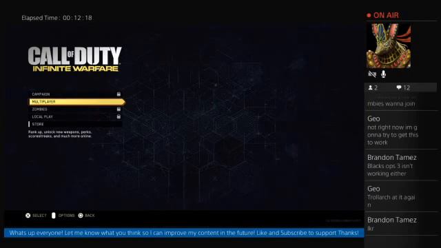 Whos ready for some Infinite Warfare! I sure am if it would load....come on Activision ☆Friend me on facebook to stay up to date @ www.facebook.com/Geoverse00 Wanna join in on the fun? Add KamikazeMario on PS4 ☆Business inquiries: geoverse00@gmail.com Thanks for watching! Catch you on the next one, stay Awesome! - Geo