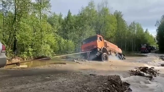 В Хабаровском крае "Крузак" вытягивал застрявший в размытой дороге "КАМАЗ"