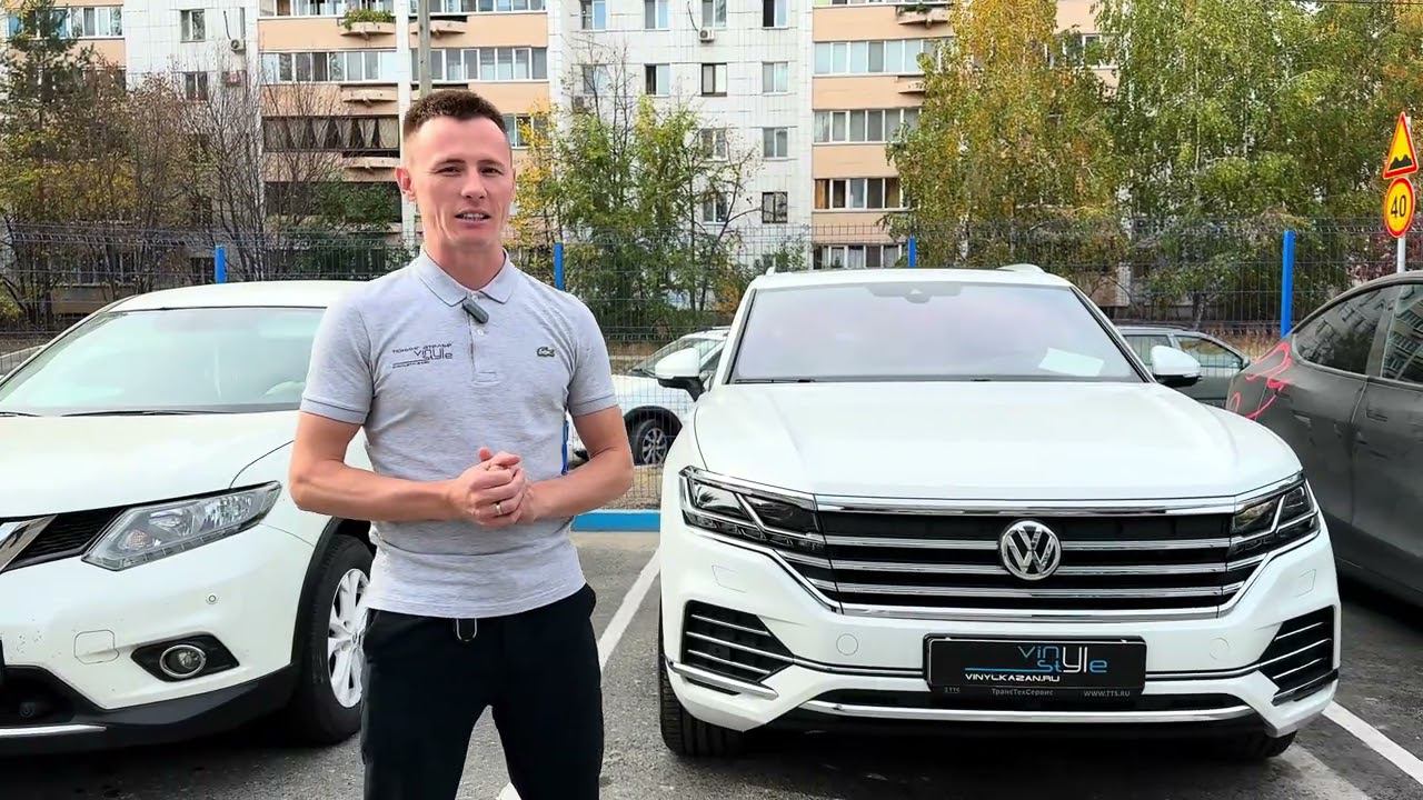 https://vinylkazan.ru Volkswagen Touareg После покупки автомобиля владелец в первую очередь позаботился о защите ЛКП. Забронировали полиуретановой плёнкой зоны риска, панораму и дверные стойки. А для комфортного пребывания в салоне, затонировали передние боковые стёкла атермальной плёнкой зелёного оттенка. К «зонам риска» относят те кузовные детали, которые чаще всего подвергаются повреждениям, на них чаще всего появляются сколы или царапины в процессе эксплуатации транспортного средства. Перечислим эти самые «зоны риска»: капот; передний бампер; передние крылья; фары; зеркала; пространство под дверными ручками; боковые стойки лобового стекла; участок крыши, это около 10-15 см от стекла; внутренние дверные пороги; зона погрузки.