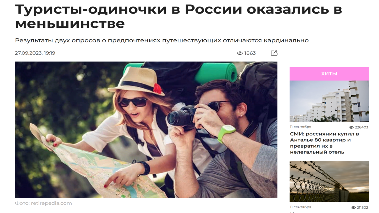 Новости туризма 27/09/2023 Туристы-одиночки в России оказались в меньшинстве #туризм