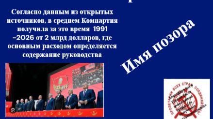 Коммунистическая партия России. Это позор всей нации! Русские не любят считать! Однако придется! Почти два миллиарда долларов, на содержание управления выделило государство с 1991 -2026 год, чтобы руководство жило при "коммунизме" - кто-то там должен жить! Это позор, прежде всего потому, что те кто несли эту идею и знамя своей кровью и своим потом открывали двери новой цивилизации, а эта бочка "дегтя" испортило то, что называлось в свое время "надеждой."