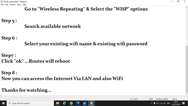 Hi Friends, Tenda Router/Repeater Step by step configuration Are below..., Step 1 : Connect your laptop/mobile to your Tenda wifi router signal Step 2 : Go to your browser and enter 192.168.0.1 in URL Step 3 : Select the "Dynamic IP" and enter the New wifi name and Password Step 4 : Go to "Wireless Repeating" & Select the "WISP" options Step 5 : Search available network Step 6 : Select your existing wifi name & existing wifi password Step7 : Click "ok" ...Router will reboot Step 8 : Now you can access the Internet Via LAN and also WiFi Thanks for watching...