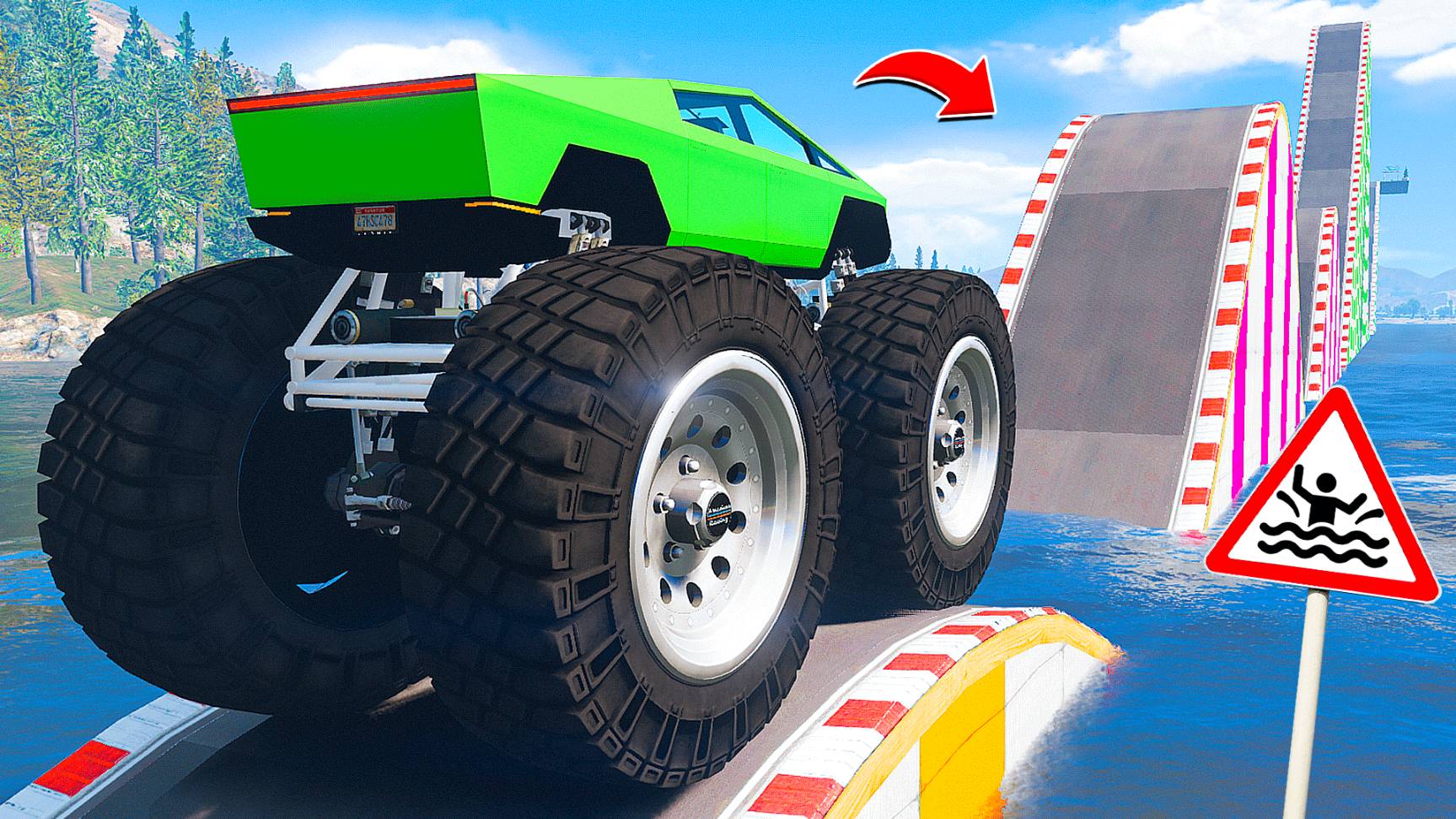 ПРОЕХАЛ ВОДНЫЕ ТРАМПЛИНЫ на ГИГАНТСКОМ КИБЕРТРАКЕ в ГТА 5 МОДЫ - ЭКСПЕРИМЕНТЫ в GTA 5 MODS