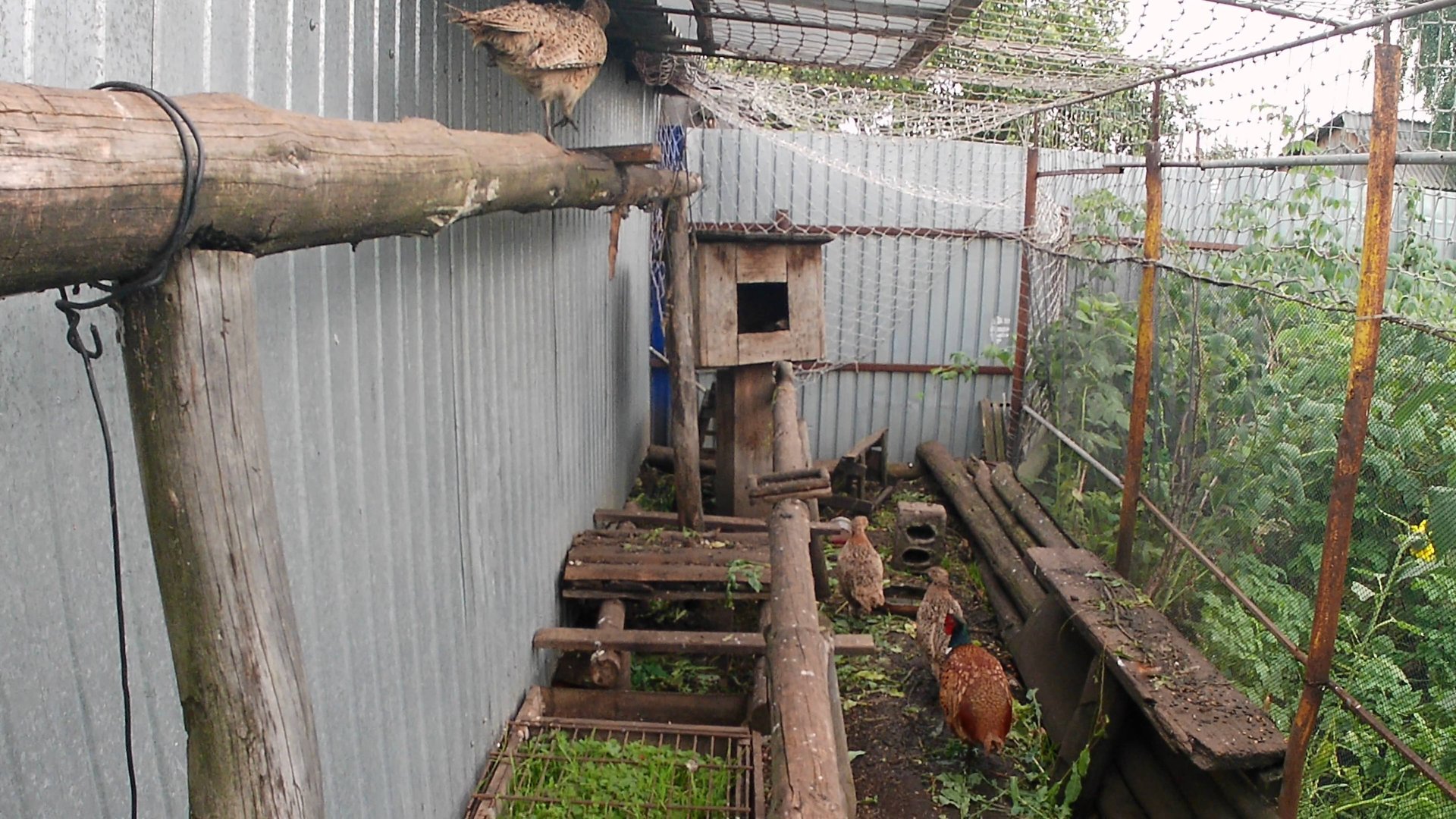 Вольер с фазанами в Челябинске. Прилетел ястреб или сокол, сидит на вольере и любуется фазанами.