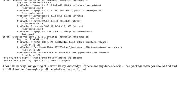 Unix & Linux: Oracle Linux 6.5: Unable to install VLC 2.0.10 from rpmfusion-free-updates Helpful? Please support me on Patreon: https://www.patreon.com/roelvandepaar With thanks & praise to God, and with thanks to the many people who have made this project possible! | Content (except music & images) licensed under cc by-sa 3.0 | Music: https://www.bensound.com/royalty-free-music | Images: https://stocksnap.io/license & others | With thanks to user Prakhar Mishra (https://unix.stackexchange.com/users/54234), user Jeff Schaller (https://unix.stackexchange.com/users/117549), user Bratchley (https://unix.stackexchange.com/users/34520), and the Stack Exchange Network (http://unix.stackexchange.com/questions/121032). Trademarks are property of their respective owners. Disclaimer: All information is provided "AS IS" without warranty of any kind. You are responsible for your own actions. Please contact me if anything is amiss at Roel D.OT VandePaar A.T gmail.com.
