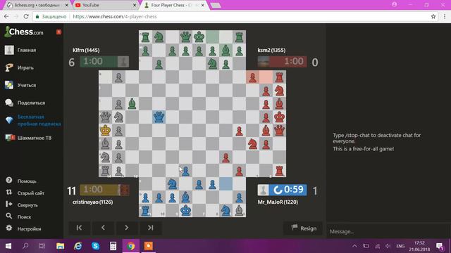 Сегодня играем в шахматы на четверых. Ссылка на игру - https://www.chess.com/4-player-chess