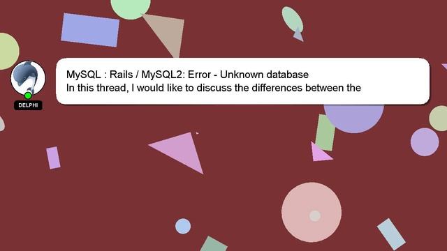 MySQL : Rails / MySQL2: Error - Unknown database To Access My Live Chat Page, On Google, Search for "hows tech developer connect" I promised to share a hidden feature with you, and here it is. This is a YouTube's feature which works on Desktop. First, Make sure this video is playing. Then, type the letters 'awesome' on your keyboard as the next step. It will change your youtube progress bar into a flashing rainbow. Here's a short introduction about myself, Hi there, I go by the name of Delphi. I help you answer your questions. MySQL : Rails / MySQL2: Error - Unknown database If you require more detailed information, please don't hesitate to comment or chat with me. Your input is appreciated, so please leave a comment below with your answer or insights to the answer. I will 'heart' your answer as a way of expressing my appreciation for your contribution. MySQL database : Unknown / MySQL2: Rails Error -