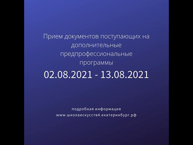 Уважаемые родители! С 2 августа 2021 г. (понедельник) по 13 августа (пятница) мы продолжаем прием заявлений поступающих в 1 класс на дополнительные предпрофессиональные программы. Прием заявлений и оформление документов ведется по графику: понед., среда и пятница с 17:00 до 20:00 вторн., четверг с 09.:00 до 12:00.