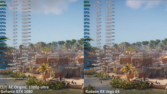 GeForce GTX 1080 vs. Radeon RX Vega 64 00:01 - Forza Motorsport 7 Forza 7 (advantage RX) 00:31 - FIFA 18 (+ GTX) 01:27 - Battlefield 1 (+ RX) 02:25 - Just Cause 3 (++ GTX) 03:30 - Call of Duty: WWII (+ RX) 05:51 - Final Fantasy XV (+ GTX) 06:49 - Hellblade: Senua's Sacrifice (++ GTX) 08:53 - Playerunknown's Battlegrounds PUBG (+ GTX) 11:08 - Dirt Rally (++ GTX) 12:57 - Far Cry Primal (+ GTX) 13:46 - Far Cry 5 (+ GTX) 14:46 - For Honor (+ GTX) 15:54 - Tom Clancy's Ghost Recon Wildlands (+ GTX) 16:45 - Tom Clancy's Rainbow Six: Siege (+ RX) 17:32 - Tom Clancy’s The Division (+ RX) 19:05 - Assassin’s Creed Unity (++ GTX) 20:30 - Assasisn's Creed Origins (++ GTX) 22:18 - Deus Ex: Mankind Divided (+ RX) 23:56 - Counter-strike: Global Offensive CS:GO (+ GTX) 25:38 - Middle-earth: Shadow of War (+ GTX) 26:38 - Dota 2 (+ GTX) 28:16 - Total War: Warhammer II (+ RX) 29:00 - Warhammer Vermintide 2 (+ RX) 30:45 - The Witcher 3 (+ GTX) 32:40 - Rise of the Tomb Raider (+ GTX) 33:24 - Hitman (+ RX) 34:14 - X-Plane 11 (++ GTX) 35:54 - Subnautica (+ GTX) 36:43 - Ashes of the Singularity: Escalation (+ GTX) 49:33 - Gran Theft Auto V GTA V (++GTX) 41:27 - Wolfenstein II: The New Colossus (+ GTX)**** **** Game (and Test) seems to be broken Ryzen 7 2700X at 4.05Ghz Gigabyte AB350 Gaming 3 (AGESA 1002a) 2x8GB DDR4-3200 Sapphire Radeon RX Vega 64 (+50% Power Limit)* / 18.6.1 Palit GeForce GTX 1080 GameRock Premium Edition / 398.11 WHQL Recorded with an external capture device * To better reflect performance of Non-Reference Board Designs TechEpiphany TechEpiphany