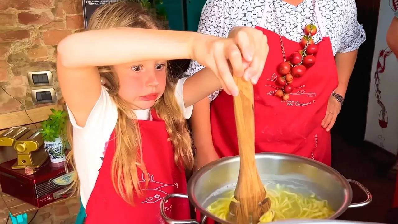 Настя и папа учатся готовить пасту и мороженое