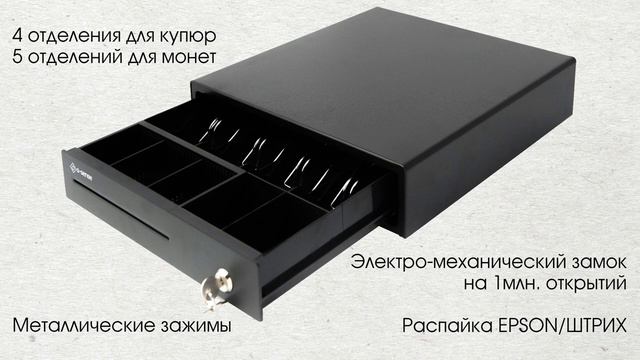 https://g-sense.ru/ Компактный электромеханический денежный ящик G-Sense 335S с горизонтальным выдвижным лотком и электромеханическим замком. Стандартный размер ящика (365x335x100 мм) упрощает комплектацию кассовой зоны в магазинах и заведениях любого формата. Ящик содержит 9 мест хранения: четыре ячейки с металлическими фиксаторами для банкнот, пять – для монет и один дополнительный отсек для чеков и ценных бумаг. Отделения для банкнот и монет в этой модели специальным образом расширены и обладают покатым краем, обеспечивая удобство работы с купюрами. Монетница вынимается. Полностью металлический корпус с металлической передней панелью и трехпозиционный электромеханический замок рассчитанный на 1 000 000 открытий. Распайка по умолчанию - EPSON =============== ХАРАКТЕРИСТИКИ - Тип замка - Электромеханический (EPSON/ШТРИХ) - Тип ключа - Трёхпозиционный - Тип денежного ящика - Горизонтальный - Количество отделений для банкнот - 4 - Количество ячеек для монет - 5 - Фиксатор купюр - Да, металлические Дополнительная информация: - Количество комбинаций ключей: 200; - Дополнительное отделение для ценных бумаг, чеков, крупных купюр и т.д. - Габариты, мм - 365x335x90 мм (коробка 380*420*135мм) - Вес нетто - 3,4кг вес брутто - 4,5кг. - Гарантия - 1 год =============== Бренд G-Sense сочетает в себе лучшие технические характеристики в бюджетном сегменте, идеально подобранные для выполнения большинства задач в сфере ScanID. Выбирая G-Sense - вы выбираете лучшее соотношение "ЦЕНА / ПРОИЗВОДИТЕЛЬНОСТЬ"