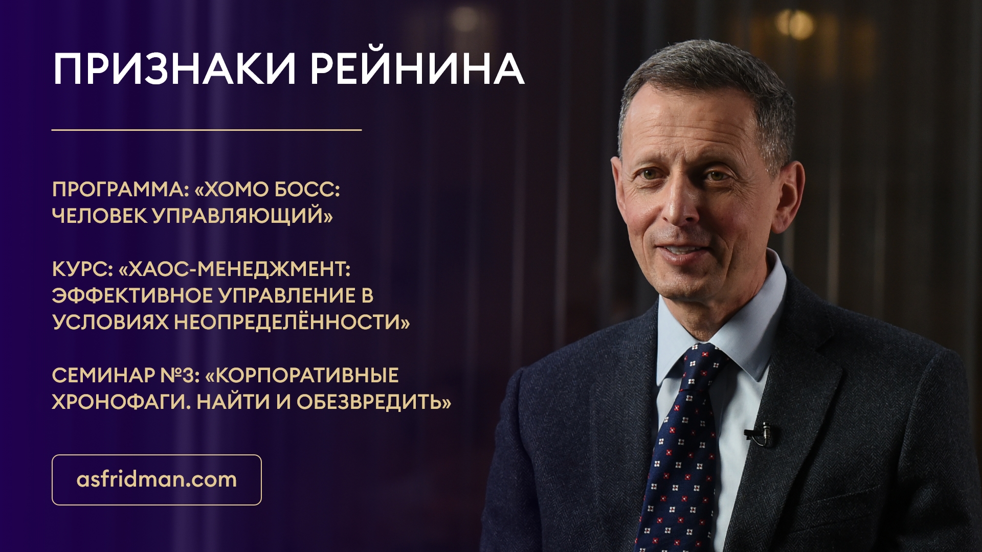 Признаки Рейнина Программа: «Хомо Босс: Человек Управляющий» Курс: «Хаос-Менеджмент: Эффективное управление в условиях неопределённости» Семинар №3: «Корпоративные хронофаги. Найти и обезвредить» Расписание открытых семинаров Александра Фридмана: https://www.asfridman.com/raspisanie/