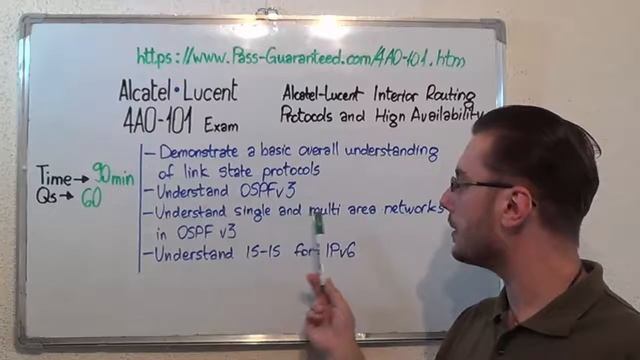 For more information on Alcatel-Lucent 4A0-101 Practice Test Questions Please Visit: https://www.Pass-Guaranteed.com/4A0-101.htm What am I going to be tested for? The 4A0-101 exam tests the candidate’s knowledge in topics such as: Demonstrate a basic overall understanding of link state protocols, Express a basic overall understanding of IP routing design, Demonstrate an understanding of route redistribution and route filter policies, Explain the basic operations of IS-IS, and ensure the successful implementation and operability of IS-IS in a network and more. Which are some of the topics of the 4A0-101 Alcatel-Lucent exam? Test Topic 1: Understand OSPFv3 Questions (Exam Coverage 21%) Test Topic 2: Understand IS-IS for IPv6 Questions (Exam Coverage 20%) Test Topic 3: Understand IPv6 basics and IPv6 addressing Questions (Exam Coverage 14%) Test Topic 4: Basic operations of IS-IS Questions (Exam Coverage 18%) Test Topic 5: Verify OSPF operations Questions (Exam Coverage 12%) Who can attend to the Alcatel-Lucent Routing Protocols test? Alcatel-Lucent 4A0-101 exam has been designed for professionals and specialists with experience in the Routing Protocols area and want to obtain a certification for the Interior Routing Protocols exam. It is recommended to have some training before attending the 4A0-101 exam. Can you give me some in-depth information on the 4A0-101 exam topics? • Configure OSPF exam in basic and complex network topologies • Understand OSPFv3 • Understand single and multi-area networks in OSPFv3 • Explain the basic operations of IS-IS, and ensure the successful test implementation and operability of IS-IS in a questions network • Understand IS-IS for IPv6 test • Define the differences between IS-IS and 4A0-101 OSPF • Verify OSPF operations and exam troubleshoot OSPF routing issues • Configure a complex network utilizing a combination of OSPF and IS-IS • Understand IPv6 basics and IPv6 test addressing What’s the 4A0-101 passing score and duration? The duration of this exam is 90 minutes (60 questions).