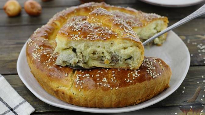 Воздушное дрожжевое тесто отлично сочетается с ароматной начинкой из куриных желудков, тушенных с луком и сметаной. А посыпанная кунжутом хрустящая корочка делает пирог с желудками ещё аппетитнее. #ДрожжевоеТесто #СдобнаяВыпечка #ЗакусочныйПирог #ПирогСПупчиками