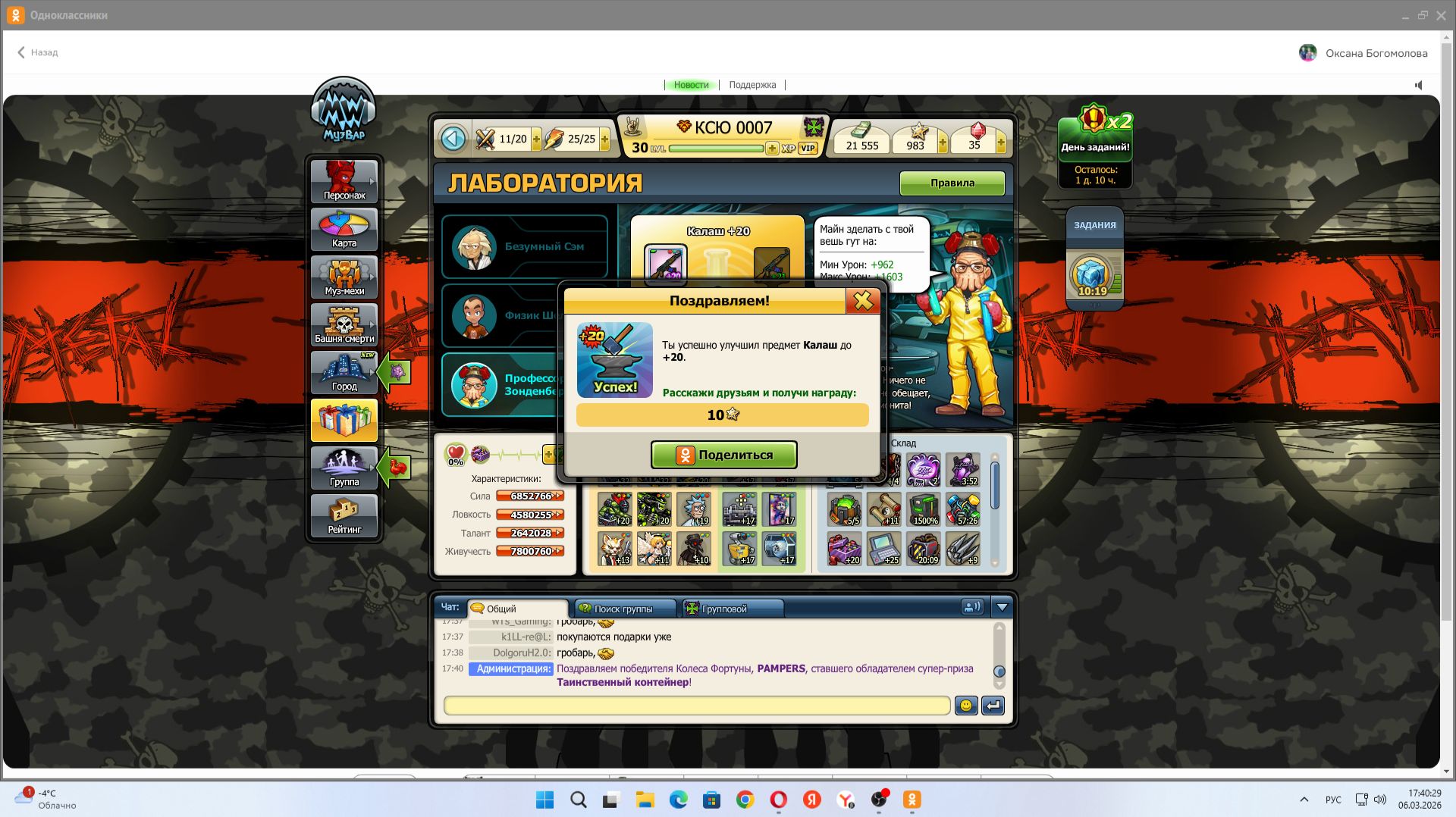 Поздравляем! +20 Успех! Ты успешно улучшил предмет Калаш до +20. Расскажи друзьям и получи награду: 10 звёзд Поделиться Добавление записи в ленту МузВар предлагает разместить в вашей ленте следующую запись Лаборатория Предмет Калаш улучшен до +20 уровня! Моя студия становится всё богаче! Получить награду MW Опубликовать Отменить