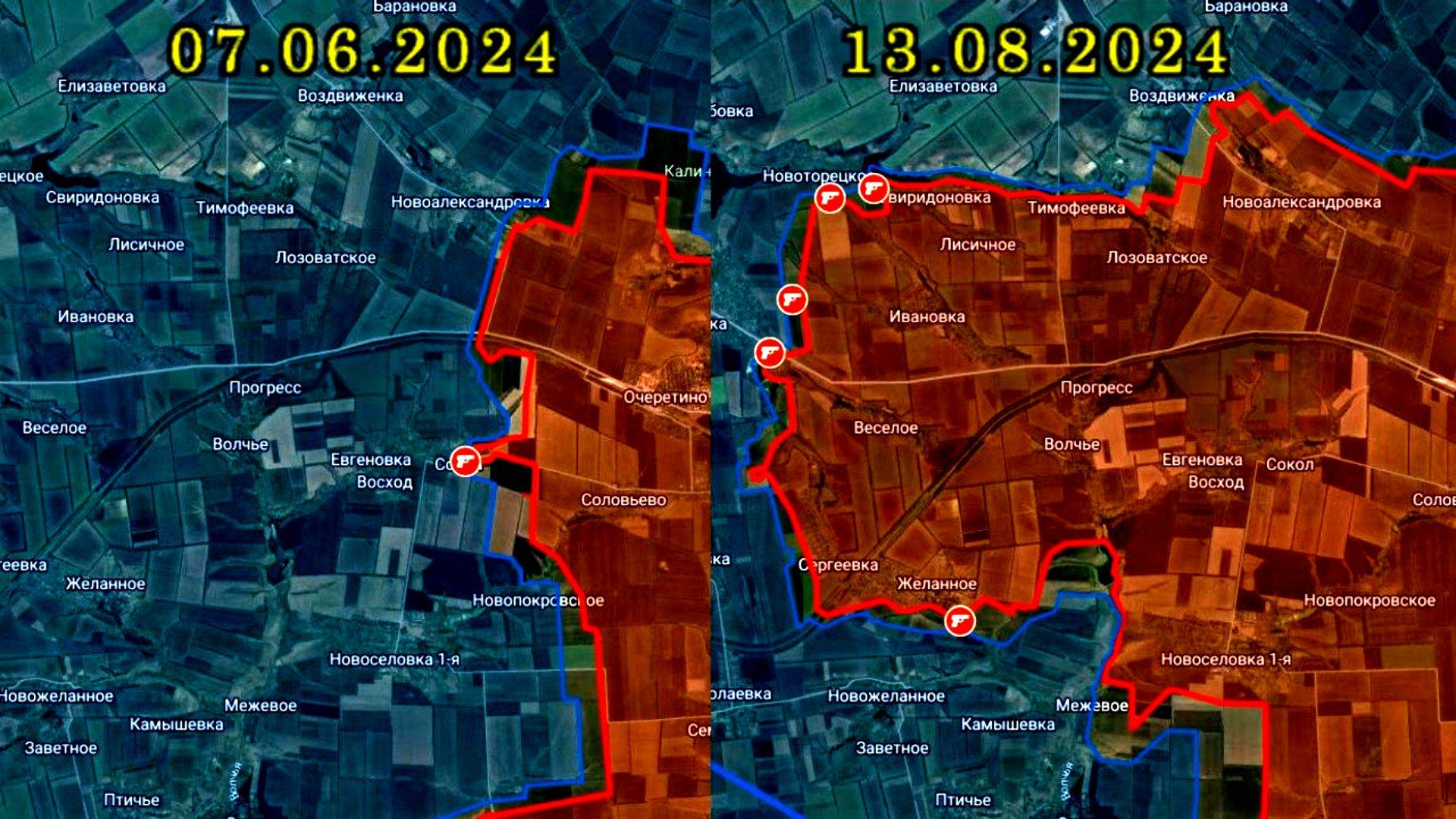 Карта боевых действий к западу от Очеретино с июнь по август 2024 года