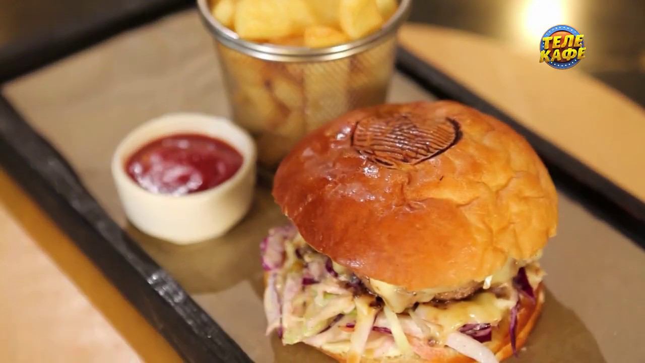 Сочная говяжья котлета с сыром и карамельным луком в сочетании с хрустящими овощами и ароматным соусом на воздушной булочке от бренд-шефа Андрея Заварницина.