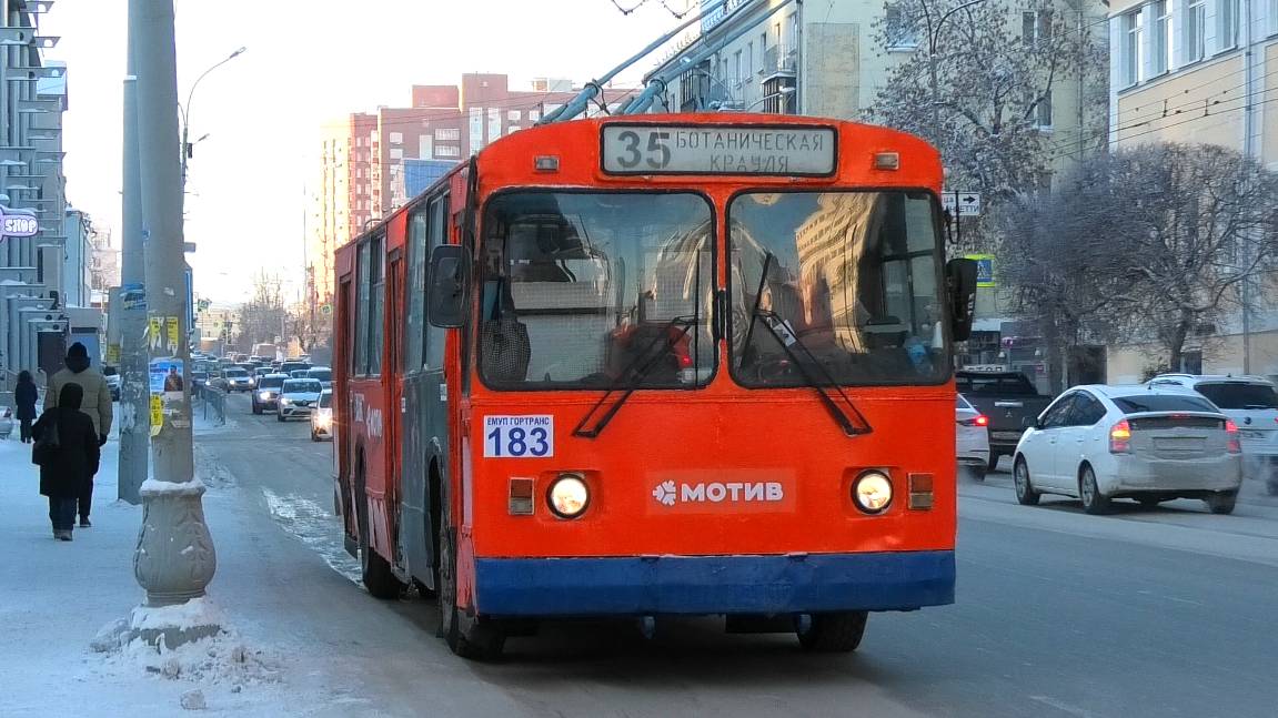 Троллейбус ЗиУ-682Г [Г00] борт. №183 маршрут №35 "Крауля - Ботаническая" следует через остановку "Театр Волхонка". Город Екатеринбург, Россия. Приписка: Октябрьское троллейбусное депо. 12.12.2023