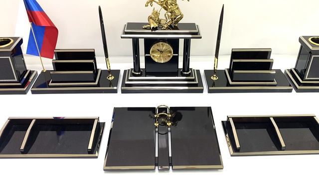 Камень — Обсидиан Натуральность камня — Натуральный камень Месторождение — Армения Длина мм. — 650 Ширина мм. — 300 Высота мм. — 150 •Материал: обсидиан двух оттенков, кварцовый механизм, латунь. •Техника исполнения: камнерезные работы, нанесение нитрида титана с помощью УВН (установка вакуумного напыление). •Размеры: при плотной компоновке на столе 1000*360*340мм. - Основание под часы 250*110*20мм-1шт. - Часы 225*80*320мм -1шт. - Карандашница 88*88*125мм-2шт. - Основание под карандашницу 112*112*20мм-2шт. - Основание под визитницу 250*110*20мм-2шт.. - Визитница 140*90*85мм-2шт. - Бумажница 250*120*30мм-2шт. - Календарница 260*200*30мм-1шт. - Ручки 10*10*195мм-2шт. •Упаковка: деревянный чемодан обтянутый кожзамом габариты 460*340*380мм. •Вес нетто: 15кг. •Вес брутто: 22,5кг. Цена: 82 150 руб. https://radugakamnya.ru/catalog/suveniry_iz_kamnya/suveniry_iz_obsidiana/pismennye_nabory_iz_obsidiana/nastolnyy_nabor_iz_obsidiana_georgiy_pobedonosets_1000_360_340mm-542515/