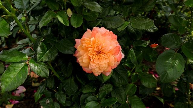 Очень приятный сильный аромат. Сильнорослая роза с мощными побегами и большими соцветиями крупных абрикосовых роз. Расцветка цветов необыкновенная.