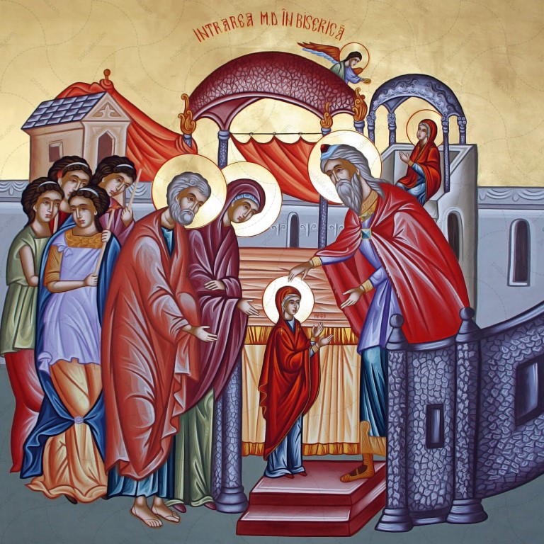 История праздника и молитва «О Пресвятая Дево, Царице небесе и земли, прежде век избранная Невесто Божия, в последняя же времена пришедшая в храм законный на обручение Жениху небесному! Ты оставила еси люди Твоя и дом отца Твоего, во еже принести Себе в жертву чистую и непорочную Богови, и первая дала еси обет всегдашняго девства. Даруй же и нам соблюдати себе в целомудрии и чистоте и в страсе Божием во вся дни живота нашего, да будем храми Духа Святаго, наипаче же помози всем, в подражание Твое во обителех живущим и обручившим себе на служение Богови, в чистоте девства провождати житие свое и от юности нести иго Христово благое и легкое, свято храняще обеты своя. Ты провела еси, Всечистая, вся дни юности Твоея во храме Господнем далече от соблазнов мира сего, в присном бодрствовании молитвенном и во всяком воздержании душевном же и телеснем, помози убо и нам отражати вся искушения вражеская от плоти, мира и диавола находящая на ны от юности нашея, и побеждати оная молитвою и постом. Ты бо, во храме Господнем со Ангелы пребывающи, украсилася еси всеми добродетельми, наипаче же смирением, чистотою и любовию, и достойно воспиталася еси, да готова будеши вместити плотию невместимое Слово Божие. Сподоби же и нам, одержимым гордостию, невоздержанием и леностию, облещися во всякое совершенство духовное, да уготовает кийждо от нас с помощию Твоею одеяние брачное души своея и елей доброделания, да не нази и неготови явимся во сретение безсмертному Жениху нашему и Сыну Твоему, Христу, Спасителю и Богу нашему, но да приимет ны с мудрыми девами во обители райския, идеже со всеми святыми сподоби нас выну славити и прославляти всесвятое имя Отца и Сына и Святаго Духа и Твое милостивое заступление всегда, ныне и присно и во веки веков. Аминь.»