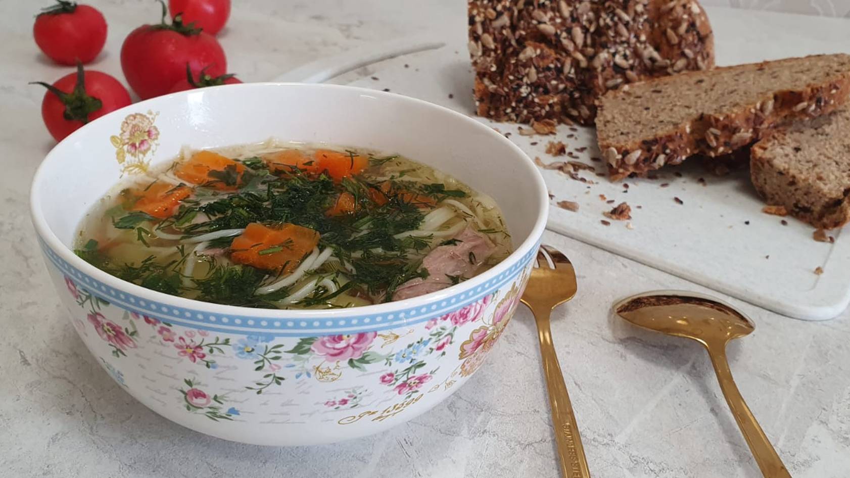 Это просто обычный суп, сваренный на бульоне из домашнего молодого петушка. Очень просто и очень вкусно. Для приготовления супа из домашнего петуха лучше всего взять тушку молодой птицы. Бульон получится наваристым и нежирным, а суп будет очень вкусным. Кроме овощей можно добавлять в суп зелень. Обязательно настаиваем суп под крышкой, так он получится более насыщенным и ароматным. Для приготовления супа потребуется около 700 граммов мяса петуха. Тушку промываем и разрезаем на части, заливаем необходимую часть мяса водой (2,5 литра). Готовлю на среднем огне, снимая пену. Прикрыла крышкой, и пусть себе томится бульон на маленьком🔥 огне, часа два. 🌞Ингредиенты: На 2,5 литра воды. 🐓Петух 700 г. домашний, разделан, ощипан и вымыт хорошо. Картофель молодой 200 гр. Морковь 100 гр. Лотос приправа 0,5 чайн.ложки Черный перец по вкусу Репчатый лук 1 шт. Лавровый лист 2 шт. Зелень по вкусу Соль 7 г. Гнезда Makfa 80 г.