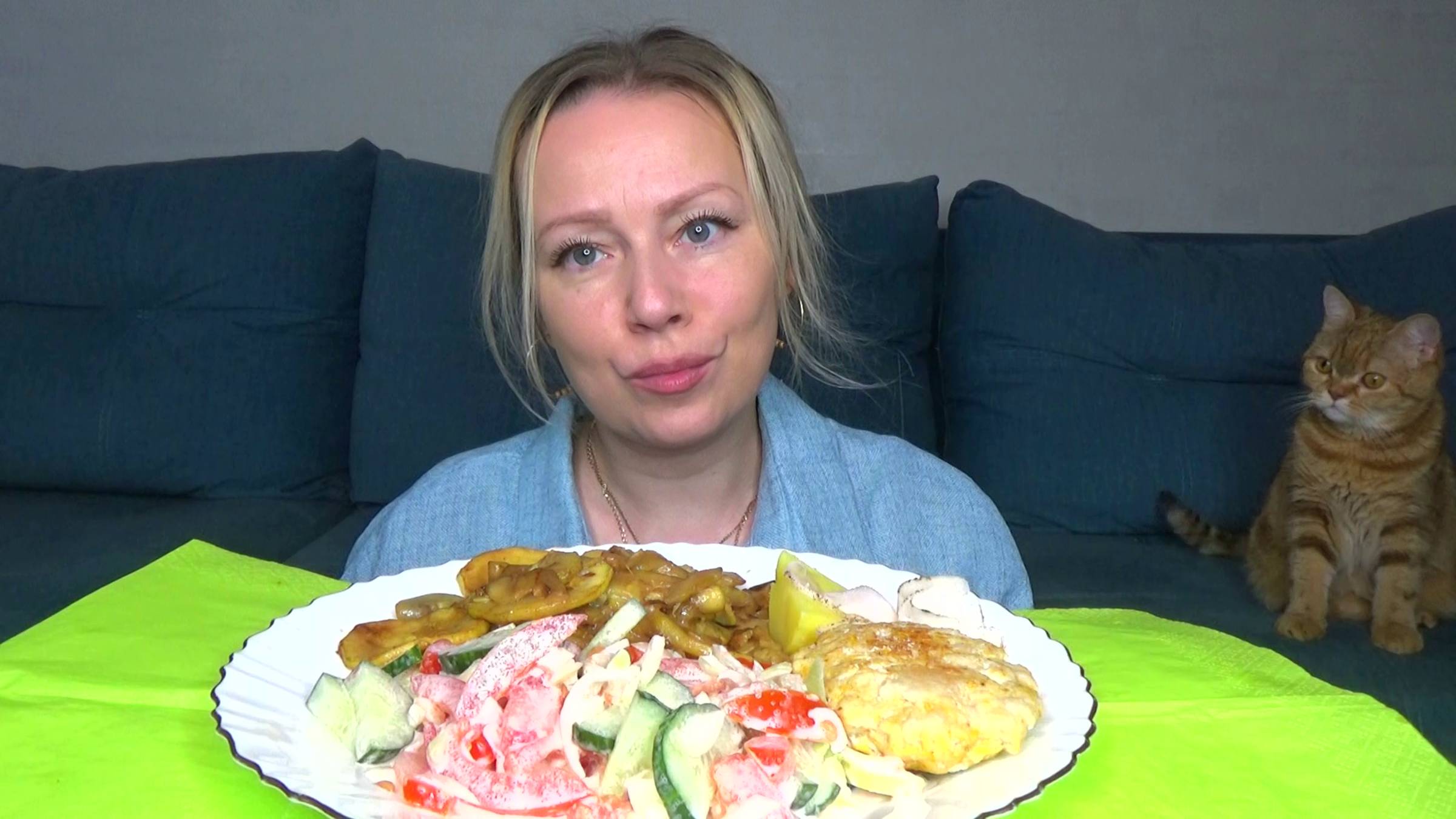 Мукбанг кабачки, сало, рубленая куриная котлета ,салат. Еда на камеру.