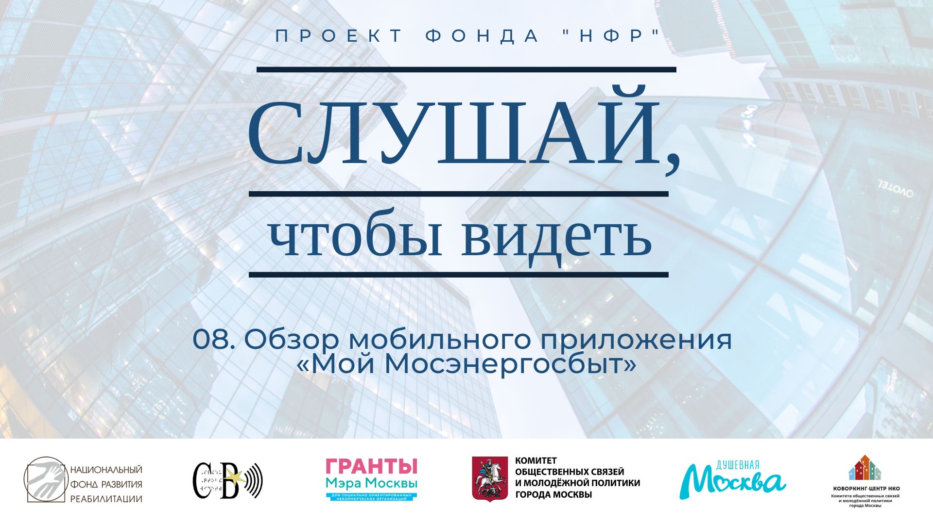 Перед вами восьмой выпуск информационно-просветительского подкаста «Слушай, чтобы видеть», направленного на аудиторию незрячих пользователей электронной техники Москвы. Эпизод посвящен разбору сервиса «Мой Мосэнергосбыт». Василий Дрожжин и Всеволод Попов описывают основной функционал и возможности приложения. Проект реализуется «Национальным фондом развития реабилитации» при поддержке Грантов Мэра Москвы для социально ориентированных НКО Комитета общественных связей и молодежной политики города Москвы. Ссылка на приложение «Мой Мосэнергосбыт» в магазине App Store: https://apps.apple.com/ru/app/%D0%BC%D0%BE%D0%B9-%D0%BC%D0%BE%D1%81%D1%8D%D0%BD %D0%B5%D1%80%D0%B3%D0%BE%D1%81%D0%B1%D1%8B%D1%82/id1439322951