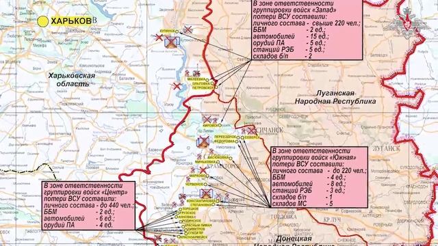 Смотрите плейлист Минобороны России новости https://rutube.ru/plst/1044565 Сводка Министерства обороны Российской Федерации о ходе СВО по состоянию на 4 сентября 2025 г. Вооруженные Силы Российской Федерации продолжают проведение специальной военной операции. Подразделения группировки войск «Север» улучшили тактическое положение. Нанесено поражение формированиям двух механизированных бригад, штурмового полка ВСУ, бригады теробороны, пограничного отряда погранслужбы Украины и полка нацгвардии в районах населенных пунктов Чернацкое, Алексеевка, Юнаковка, Храповщина, Кондратовка и Варачино Сумской области. На Харьковском направлении нанесено поражение подразделениям мотопехотной бригады и штурмового полка ВСУ в районах населенных пунктов Меловое и Волчанск Харьковской области. ▪ Противник потерял до 180 военнослужащих, боевую бронированную машину, 12 автомобилей и два орудия полевой артиллерии. Уничтожены три склада материальных средств. Подразделения группировки войск «Запад» заняли более выгодные рубежи и позиции. Нанесено поражение живой силе и технике механизированной, штурмовой бригад ВСУ и бригады теробороны в районах населенных пунктов Малеевка, Ольговка, Купянск Харьковской области, Петровское Луганской Народной Республики и Кировск Донецкой Народной Республики. ▪ Потери ВСУ составили свыше 220 военнослужащих, две боевые бронированные машины, 15 автомобилей и пять артиллерийских орудий, в том числе три западного производства. Уничтожены пять станций радиоэлектронной борьбы и два склада боеприпасов. Подразделения «Южной» группировки войск улучшили тактическое положение. Нанесено поражение формированиям механизированной, аэромобильной бригад ВСУ и бригады нацгвардии в районах населенных пунктов Степановка, Васюковка, Червоное, Миньковка, Северск, Бересток, Переездное, Марково, Федоровка и Константиновка Донецкой Народной Республики. ▪ Противник потерял до 220 военнослужащих, четыре боевые бронированные машины и восемь автомобилей. Уничтожены три станции радиоэлектронной борьбы, склад боеприпасов и пять складов материальных средств. Подразделения группировки войск «Центр» заняли более выгодные рубежи и позиции. Нанесено поражение живой силе и технике трех механизированных, десантно-штурмовой бригад ВСУ, бригады теробороны и бригады нацгвардии в районах населенных пунктов Торецкое, Удачное, Грузское, Сухой Яр, Анновка, Димитров, Родинское, Красноармейск и Красный Лиман Донецкой Народной Республики. ▪ Потери украинских вооруженных формирований составили до 440 военнослужащих, две боевые бронированные машины, шесть автомобилей и четыре орудия полевой артиллерии. Подразделения группировки войск «Восток» продвинулись в глубину обороны противника и установили контроль над населенным пунктом Новоселовка Днепропетровской области. Кроме того, полностью завершено освобождение территории Донецкой Народной Республики в полосе действий группировки войск «Восток». Нанесено поражение формированиям двух механизированных бригад ВСУ и бригады морской пехоты в районах населенных пунктов Гавриловка, Новопавловка Днепропетровской области, Полтавка, Успеновка и Новоивановка Запорожской области. ▪ Противник потерял свыше 240 военнослужащих, 13 автомобилей и радиолокационную станцию контрбатарейной борьбы. Подр