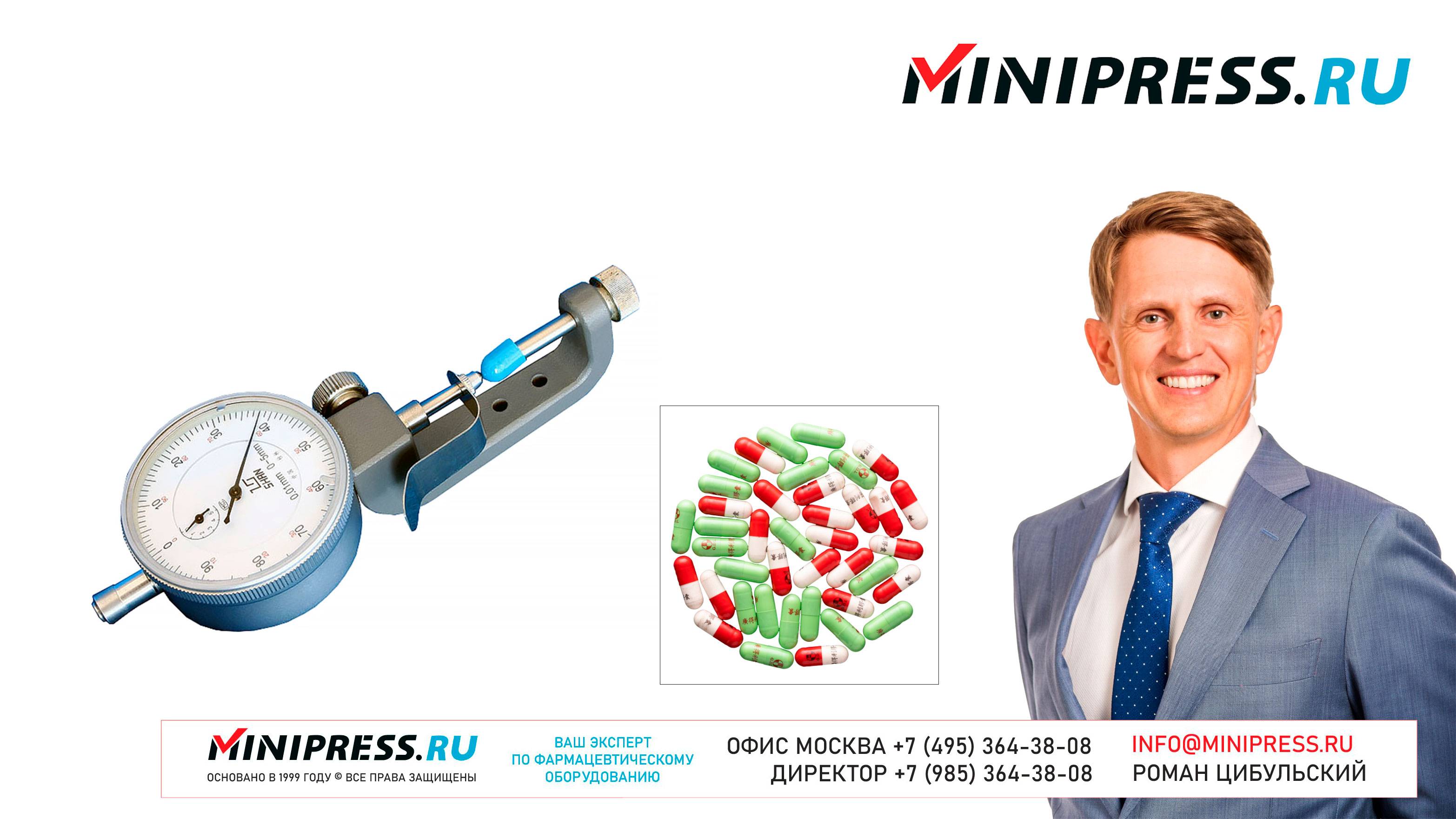 Анализатор толщины капсул и таблеток HD-03 https://Minipress.ru/katalog/ Фармацевтическое оборудование. Специалисты в фармацевтическом оборудовании и технологиях производства лекарств. Более 20 лет оказываем нашим клиентам помощь в выборе, поставке, наладке различного фармацевтического оборудования! Вы в поиске надежного поставщика оборудования? Мы предоставим вам лучший сервис 24/7. Собрана лучшая команда профессионалов в фармацевтической отрасли и налажены стабильные связи с лучшими производителями. Мы не только продаем, но и производим многие модели оборудования Директор компании Минипресс Роман Цибульский Поставка фармацевтического оборудования в Россию Пишите: info@minipress.ru Телефон +7(495)364-38-08; Мобильный +375(29)308-00-00 Россия, Москва Skype: RomanTsibulsky; ICQ: 310-134-490 Подписывайтесь на наш видео канал на Youtube https://youtube.com/user/wwwMinipressru Обновленный сайт https://Minipress.ru Каталог оборудования https://Minipress.ru/katalog/ МЫ В СОЦИАЛЬНЫХ СЕТЯХ G+ https://plus.google.com/+RomanTsibulsky/ FB https://facebook.com/roman.tsibulsky YOUTUBE https://youtube.com/user/wwwMinipressru IN https://ru.linkedin.com/pub/roman-tsibulsky/a6/933/661 БОЛЬШОЙ КАТАЛОГ ФАРМАЦЕВТИЧЕСКОГО ОБОРУДОВАНИЯ https://minipress.ru/katalog/ Постоянно обновляемый каталог различного фармацевтического оборудования с фотографиями, описаниями, видео и ценами. ПЕРСОНАЛЬНЫЙ МЕНЕДЖЕР 24 ЧАСА https://minipress.ru/katalog/ Вы общаетесь по всем вопросам, с момента первой консультации и до получения оборудования, с одним специалистом. СПЕЦИАЛИСТЫ И ТЕХНОЛОГИ https://minipress.ru/katalog/ Имеем обширные связи в фармацевтической среде, найдем любого специалиста, поможем с освоением оборудования и технологий. ОБСУЖДЕНИЕ ВАШИХ ИДЕЙ ПО ПРОИЗВОДСТВУ ПРОДУКЦИИ https://minipress.ru/katalog/ Поможем в оценке ваших идей. Большой опыт в организации различных производств и выпуске продукции. Ценные советы. ФАРМАЦЕВТИЧЕСКОЕ ОБОРУДОВАНИЕ Мы поставили перед собой задачу, помогать нашим клиентам в правильном выборе фармацевтического оборудования. Многолетний опыт подобной деятельности показывает, что многие клиенты сталкиваются, в первую очередь, с непониманием технологического процесса. Покупка оборудования должна быть финальной точкой после подробного обсуждения задачи, консультацией с производителем оборудования, отправкой сырья и материалов на фабрику, тестирования в работе. ДЛЯ ТАБЛЕТОК https://minipress.ru/katalog/category/farmacevticheskoe_oborudovanie/ Смешивание порошков, гранулирование, прессование, обеспыливание, покрытие оболочками, фасовка, упаковка, счет, нанесение логотипов ДЛЯ ЖЕЛАТИНОВЫХ КАПСУЛ https://minipress.ru/katalog/category/farmacevticheskoe_oborudovanie/kapsulyatory-dlya-tverdyh-zhelatinovyh-kapsul/ Фасовка порошков и масел, обеспыливание, счет и фасовка, упаковка, нанесение логотипов. ФАСОВКА И УПАКОВКА https://minipress.ru/katalog/category/upakovochnoe_oborudovanie/ Упаковка в пластиковые и стеклянные флаконы, блистер, фольгу, ламинированную бумагу, стеклянные ампулы, саше, стрипы, тубы, тюбики, контурную ячейку. ТЕХНОЛОГИЧЕСКОЕ https://minipress.ru/katalog/category/eksperimentalnoe-oborudovanie/ Лабораторное, аналитическое, подготовительное, отдельные машины и линии под ключ. СФЕРЫ ДЕЯТЕЛЬНОСТИ Наша компания занимается множеством направлений фармацевтического бизнеса! Предлагаем Вам посетить страницы нашего сайта https://www.Minipress.ru по различным специализациям. ОБОРУДОВАНИЕ ДЛЯ НАКЛЕЙКИ ЭТИКЕТОК НА БУТЫЛКИ АМПУЛЫ ФЛАКОНЫ https://minipress.ru/katalog/oborudovanie-s-otzyvami/oborudovanie-dlya-naklejki-etiketok-na-butylki-ampuly-flakony/ Автоматическое этикетировочное оборудование для этикеток на клеевой основе БЛИСТЕРН
