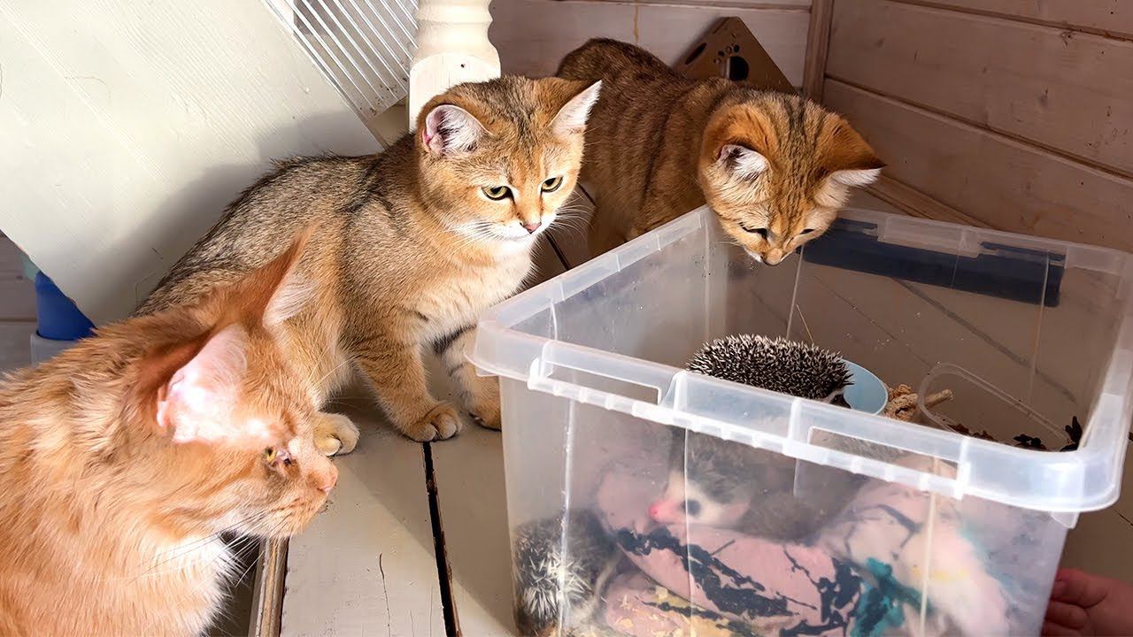 Реакция барханных кошек и мейн-кунов на ежей / Все кошки синхронизировались